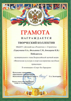 1. Творческий коллектив МБДОУ «Детский сад «Родничок» г. Строитель» Уржумцева О.А., Фильшина С.М., Бондарева К.В., Победитель муниципального этапам Всероссийской заочной акции «Физическая культура и спорт-альтернатива пагубным привычкам» (приказ №866 от 13.11.2020)