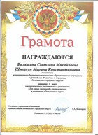 2. Фильшина Светлана Михайловна, Уржумцева Ольга Анатольевна, Призеры 3 степени межрегионального заочного конкурса видеороликов «Физкультурная минутка в дошкольном, начальном общем, основном общем, среднем общем и среднем профессиональном образовании» (от 22.12.2021 №1360-ОД)